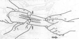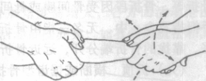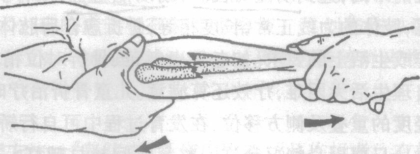 (十) 回旋 多用于矫正背向移位的斜型、螺旋型骨折,或有软组织嵌入的骨折。有软组织嵌入的横断骨折,须加重牵引,使两骨折段分离,解脱嵌入骨折断端的软组织,而后放松牵引,术者分别握远近骨折段,按原来骨折移位方向逆向回转,使断端相对,从断端的骨擦音来判断嵌入的软组织是否完全解脱。