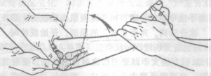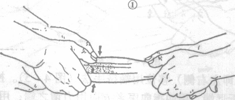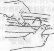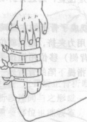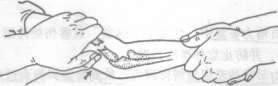 (七)触碰 又称叩击手法,用于须使骨折部紧密嵌插者,横型骨折发生于干骺端时,骨折整复夹板固定后,可用一手固定骨折部的夹板,另一手轻轻叩击骨折的远端,使骨折断