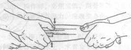 (四)提按 重叠、旋转及成角畸形矫正后,侧方移位就成了骨折的主要畸形。对于侧方移位,医者借助掌、指分别置于骨折断端的前后或左右,用力夹挤,迫其就位。侧方移位可分为前后侧移位和内外侧移位。前后侧(即上下侧或掌背侧)移位用提按手法(图4—4)。操作时,医者两手拇指按突出的骨折一端向下,两手四指提下陷的骨折另一端向上。
