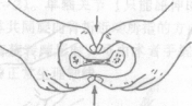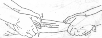 (五)端挤 内外侧(即左右侧)移位用端挤手法(图4—5)。操作时,医者一手固定骨折近端,另一手握住骨折远端,用四指向医者方向用力谓之端;用拇指反向用力谓之挤,将向外突出的骨折端向内挤迫。经过提按端挤手法,骨折的侧方移位即得矫正。但在操作时手指用力要适当,方向要正确,部位要对准,着力点要稳固。术者手指与患者皮肤要紧密接触,通过皮下组织直接用力于骨折端,切忌在皮肤上来回摩擦,以免损伤皮肤。