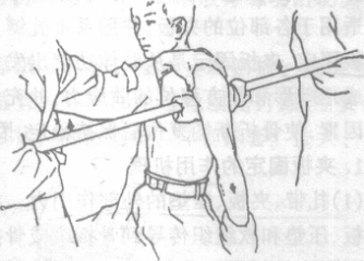 (十二) 杠杆 本法是利用杠杆为支撑点,力量较大,多用于难以整复的肩关节脱位或陈旧性脱位。采用一长lm、直径为4~5em圆木棒,中间部位以棉垫裹好,置于患侧腋窝,两助手上抬,术者双手握住腕部,并外展40。向下牵引,解除肌肉痉挛,使肱骨头摆脱盂下的阻挡,容易复位(图4—12)。整复陈旧性关节脱位,外展角度需增大,各方面活动范围亦加大,以松解肩部粘连。本法因支点与牵引力量较大,活动范围亦大,如有骨质疏松和其他并发症应慎用,并注意勿损伤神经血管。