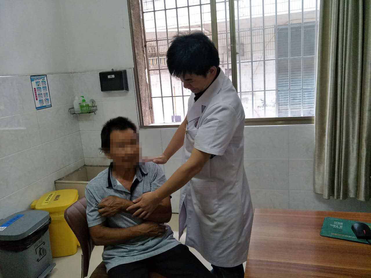 (王主任在给手法复位后的患者作搭肩测试)