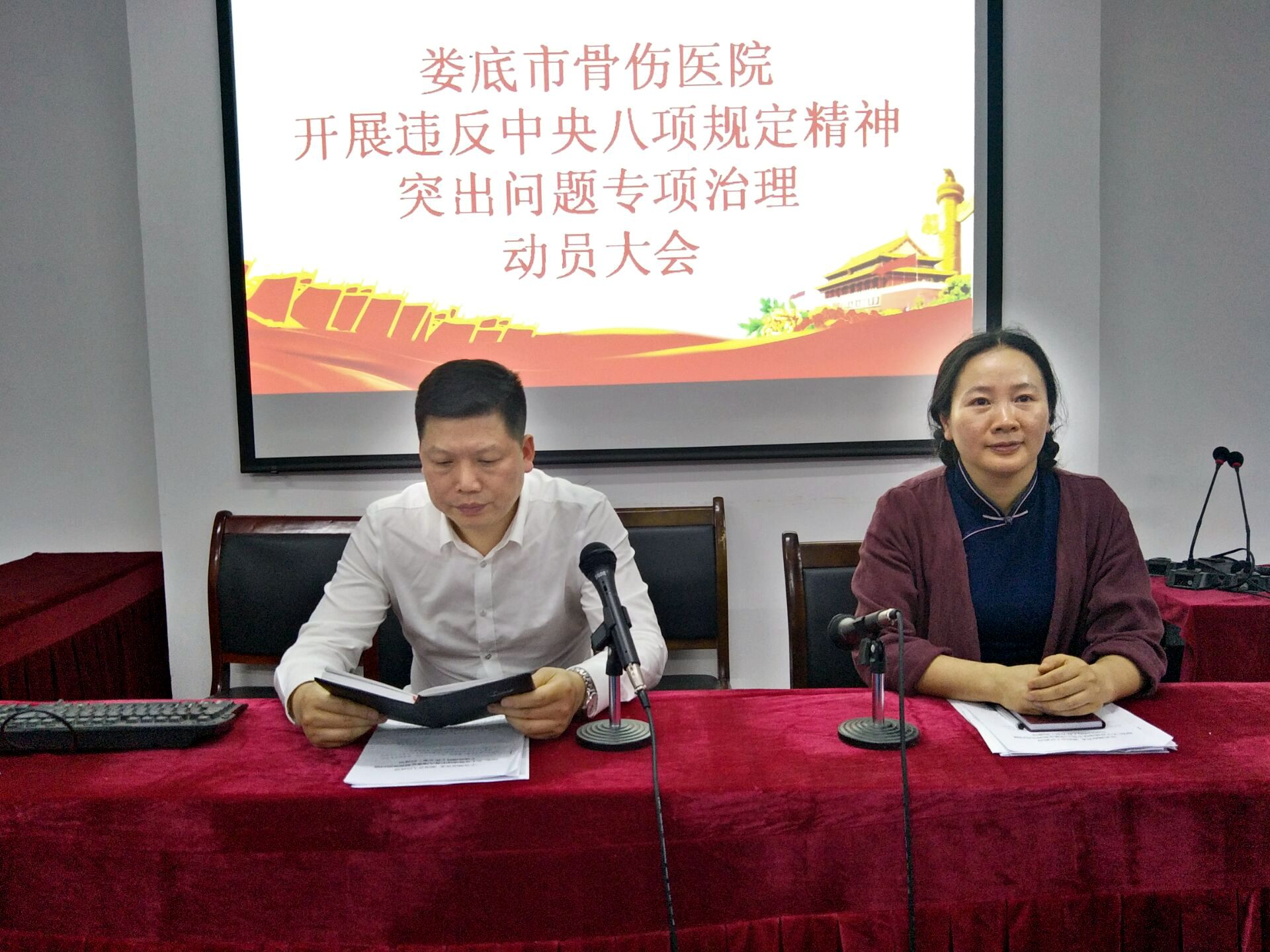 4月23日晚上,娄底市骨伤医院召开全院职工大会,动员部署开展违反中央八项规定精神突出问题专项治理工作。院长、支部书记刘卓华主持会议,支部副书记彭碧华作上级文件传达。