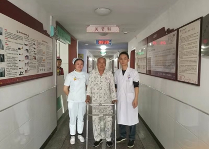 10月8日上午,娄底市骨伤医院关节科病房上演了温馨的一幕,顺利完成人工膝关节置换术即将出院的黄大伯,开心地拉着科室负责人王开颜、护士长刘典合影留念。