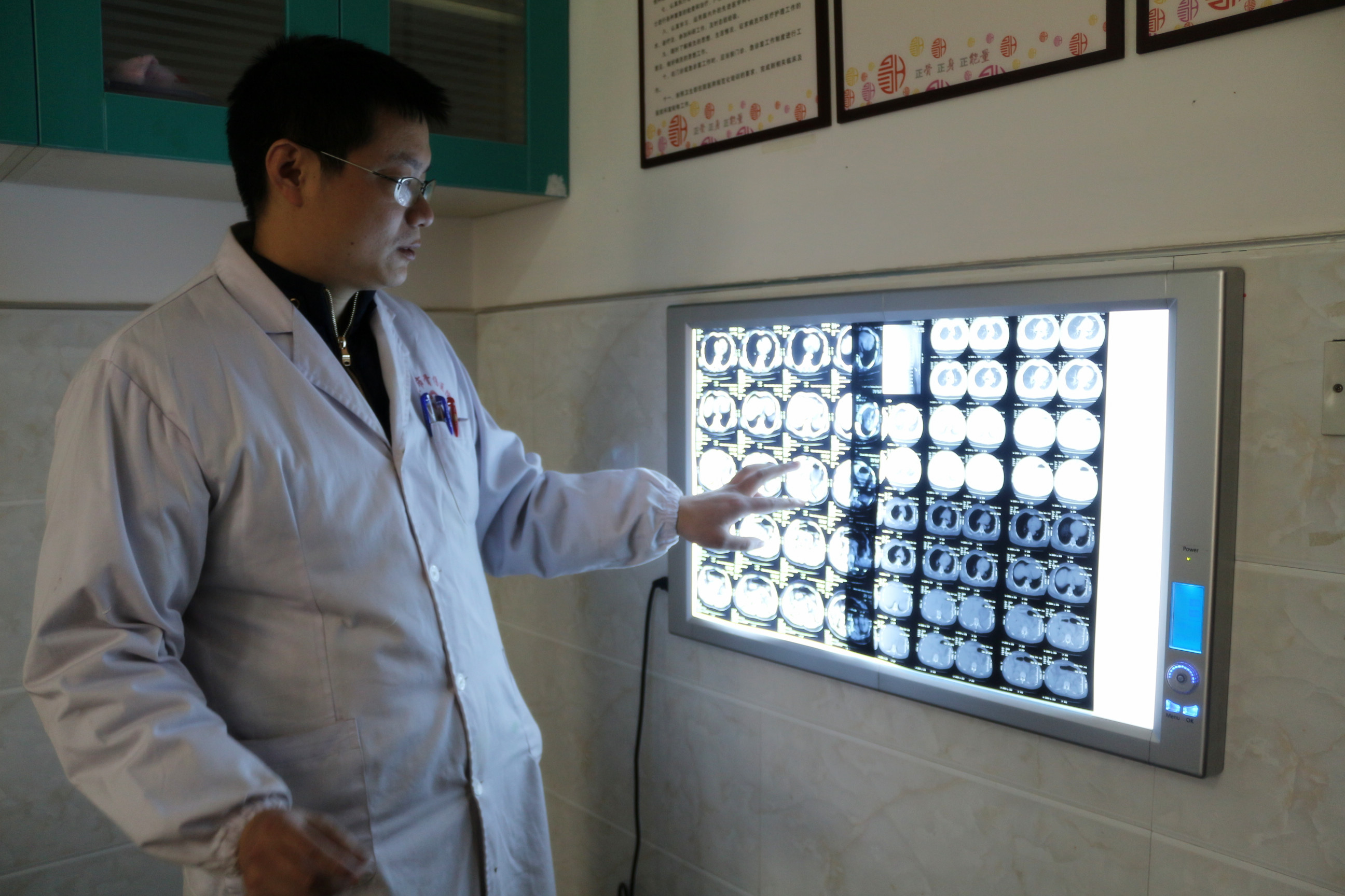五病室副主任李伟雄医师正在仔细查看邵某腹部CT片