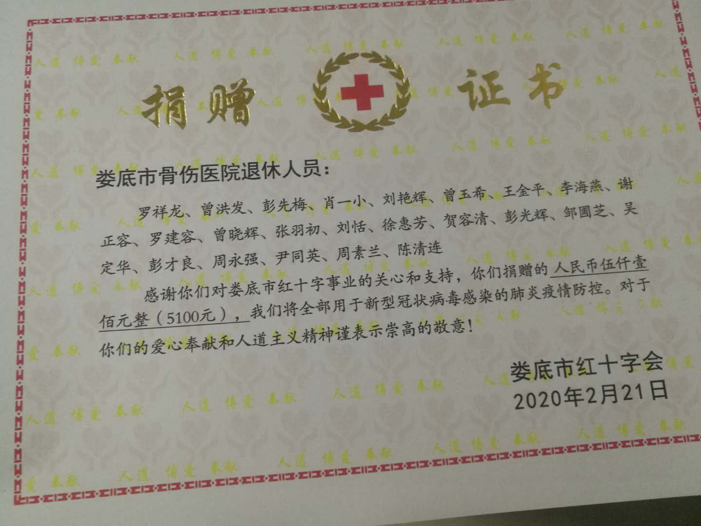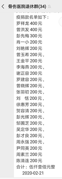 自新冠肺炎疫情爆发以来,全国上下军民同心抗击疫情,娄底市骨伤医院退休老同志们看在眼里急在心里,在切实做好自身防控的同时,决心践行社会责任和使命担当,为抗击疫情贡献自己的力量。老党员、原院办主任、疫情募捐发起人彭先梅介绍:我们虽退休在家,但大家每天都会在退休群里关注新冠肺炎疫情形势,牵挂我们医院一线抗疫战士,被他们冲锋在前,不惧病毒的奉献精神所感动……我们虽人老了,但爱心未老。此前,我已在所属社区党支部捐款,但还是觉得作为已退休的党员,应当在单位继续发挥先锋模范作用。让我意想不到的是在退休群里倡议还不到3个小时,我们的老领导、老党员、老技术骨干等23名老同志迅速捐款5100元,我为他们的速度感动,我为他们的爱心点赞。绵薄之力,希望能帮助疫区人民,共渡难关。