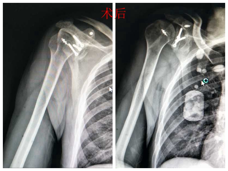 邓先生受伤后,肱骨头骨折损伤、肩胛盂损伤是肩关节不稳定的重要因素,术中的难点在关节粘连的松解复位,肱骨头缺损的修复、关节盂的修复,植骨选择。术中,以王胜冬主任为首的专业团队,通过小切口,将肩胛骨上带肌腱的喙突骨块,移位到肩关节前下方,形成一个坚强的动力性骨性支柱,肱骨头缺损用岗下肌填塞,防止肱骨头外展外旋时反复脱位,实现了精准牢固的治疗。
