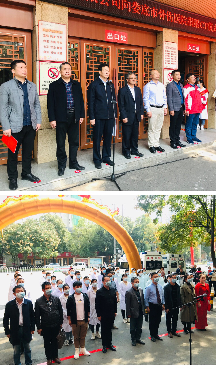 10月10日上午,娄底市骨伤医院在院前举行明峰医疗系统股份有限公司爱心CT捐赠仪式。娄底市人民政府副市长赵应良、明峰医疗系统股份有限公司芶正猛、李巍、市卫生健康委党组书记、主任罗琳、党组成员、副主任刘兆宏、市红十字会秘书长刘鸥等领导出席本次捐赠仪式。